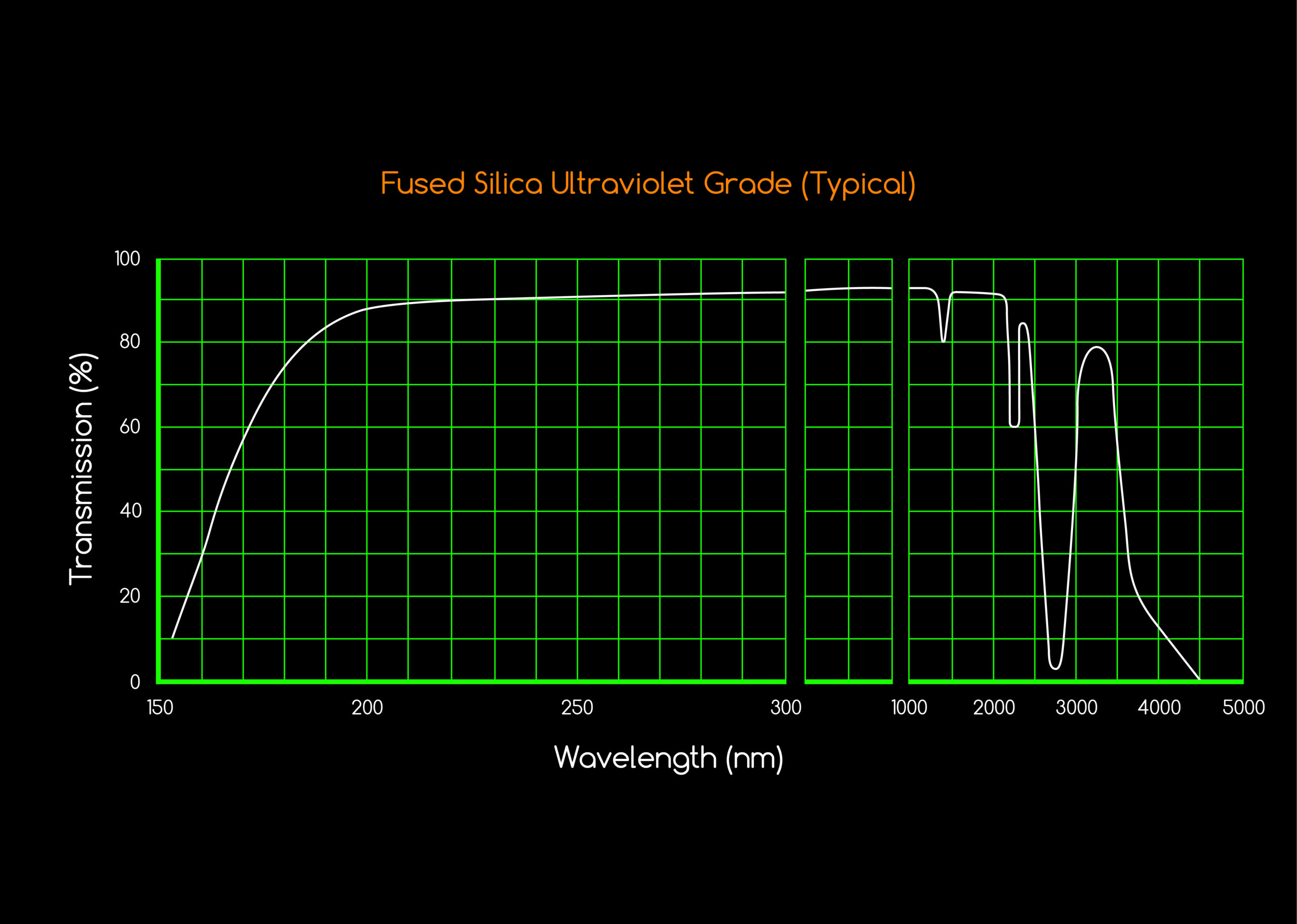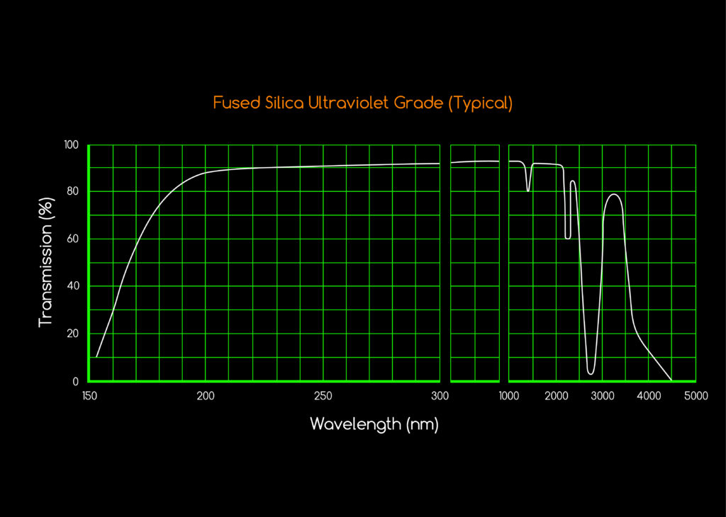 Ultraviolet-Grade Fused Silica Windows transmit light reaching as far down as 160nm, with maximum transmission from 195-2100nm. The broad transmission range from UV-VIS-NIR makes it ideal for UV applications, as well as through the visible spectrum to NIR region. UV Fused Silica also provides a low coefficient of thermal expansion with excellent homogeneity. Due to its durability qualities, Fused Silica is also often used in applications where high laser damage threshold or high heat is required.