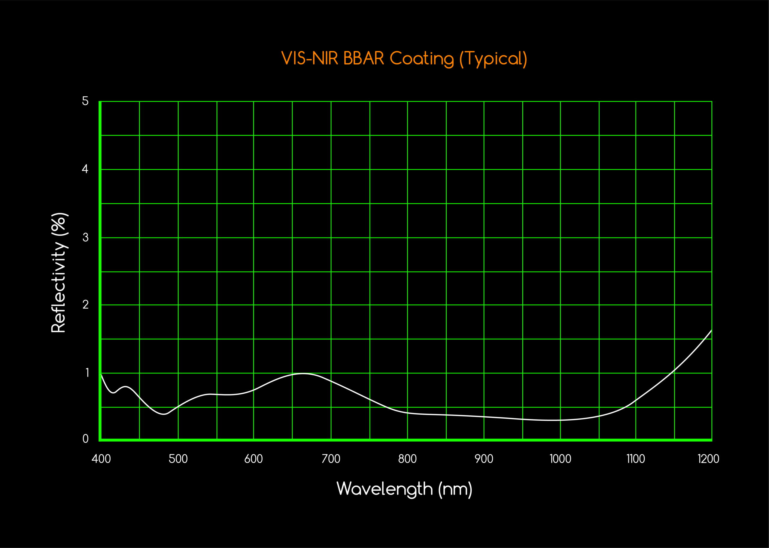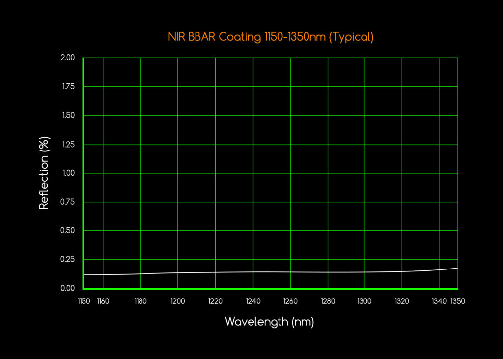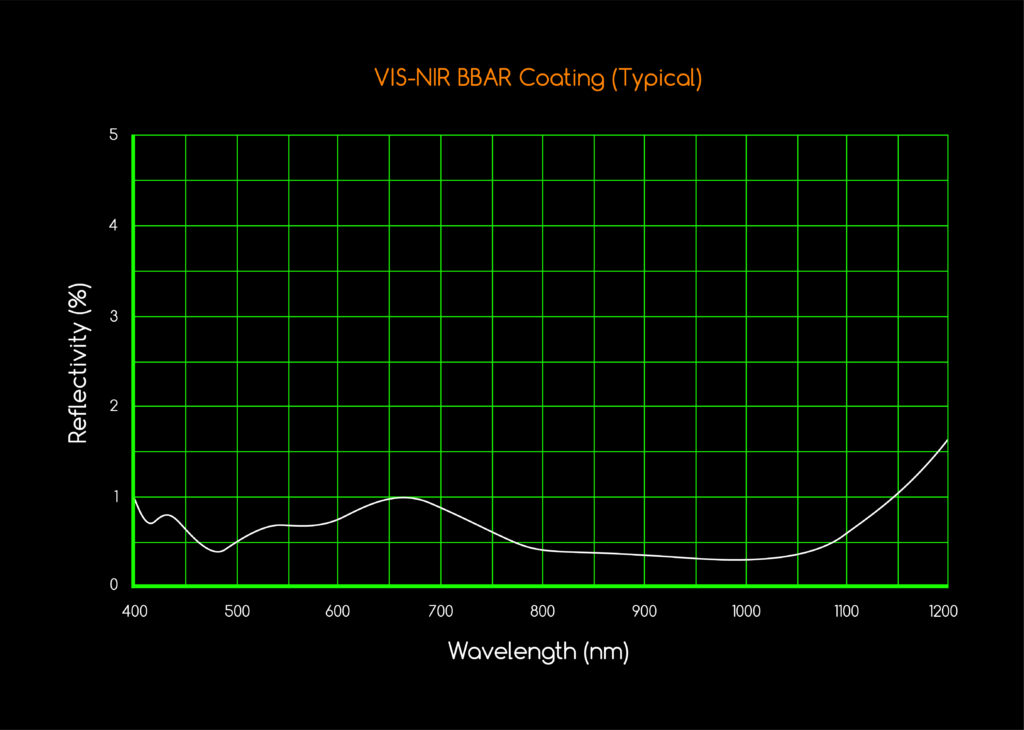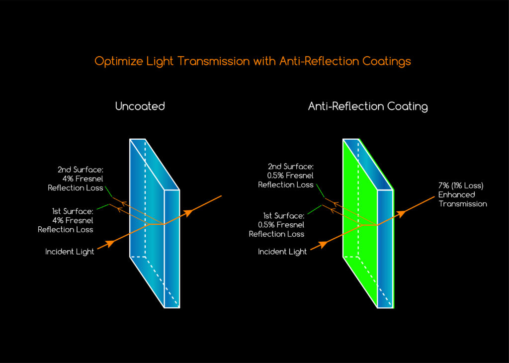 For comparative purposes, an uncoated glass window with negligible absorption losses only transmits approximately 92% of the light due to reflection loss (4% reflection loss from each glass/air surface). Our Near-IR BBAR coating reduces reflection loss to less than a 1.0% average from 400-1100nm per surface, resulting in superior light transmission.