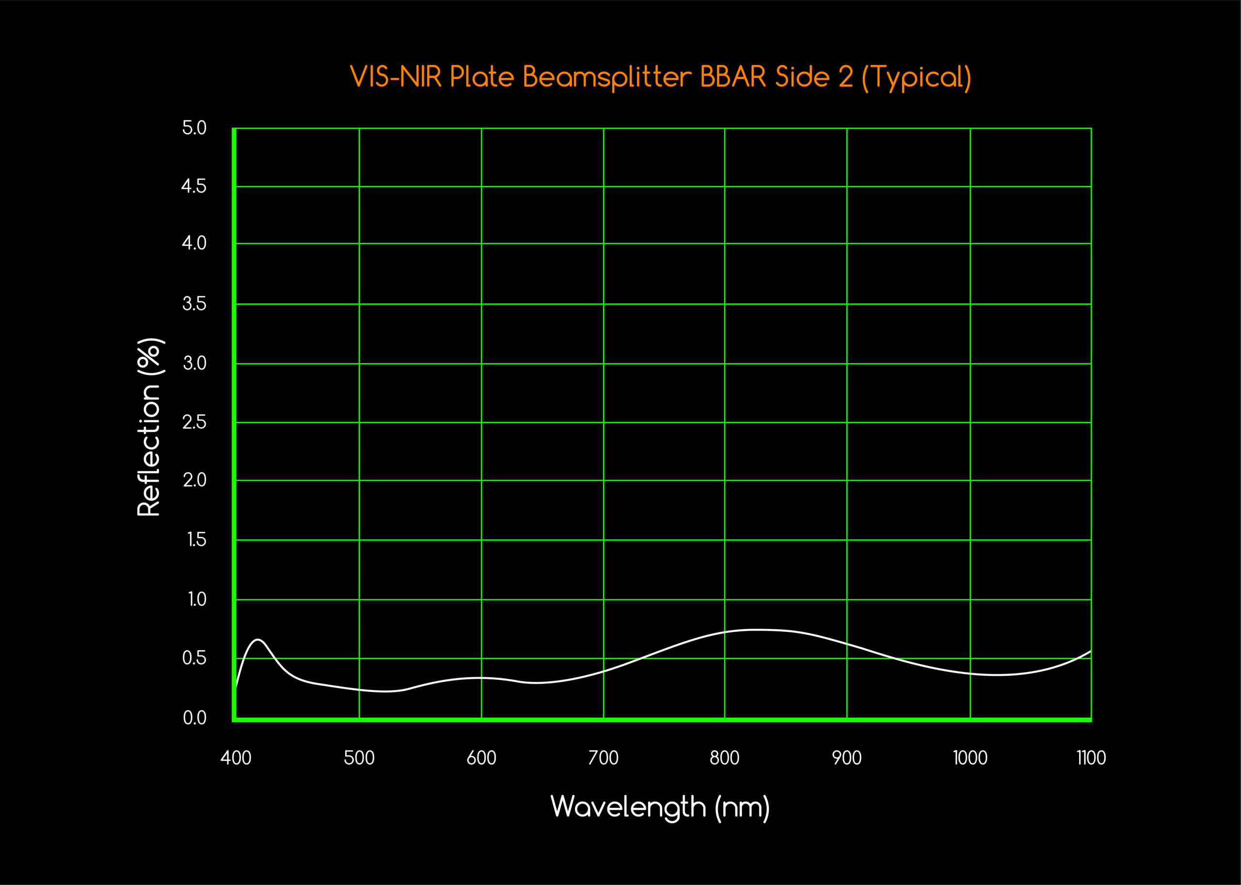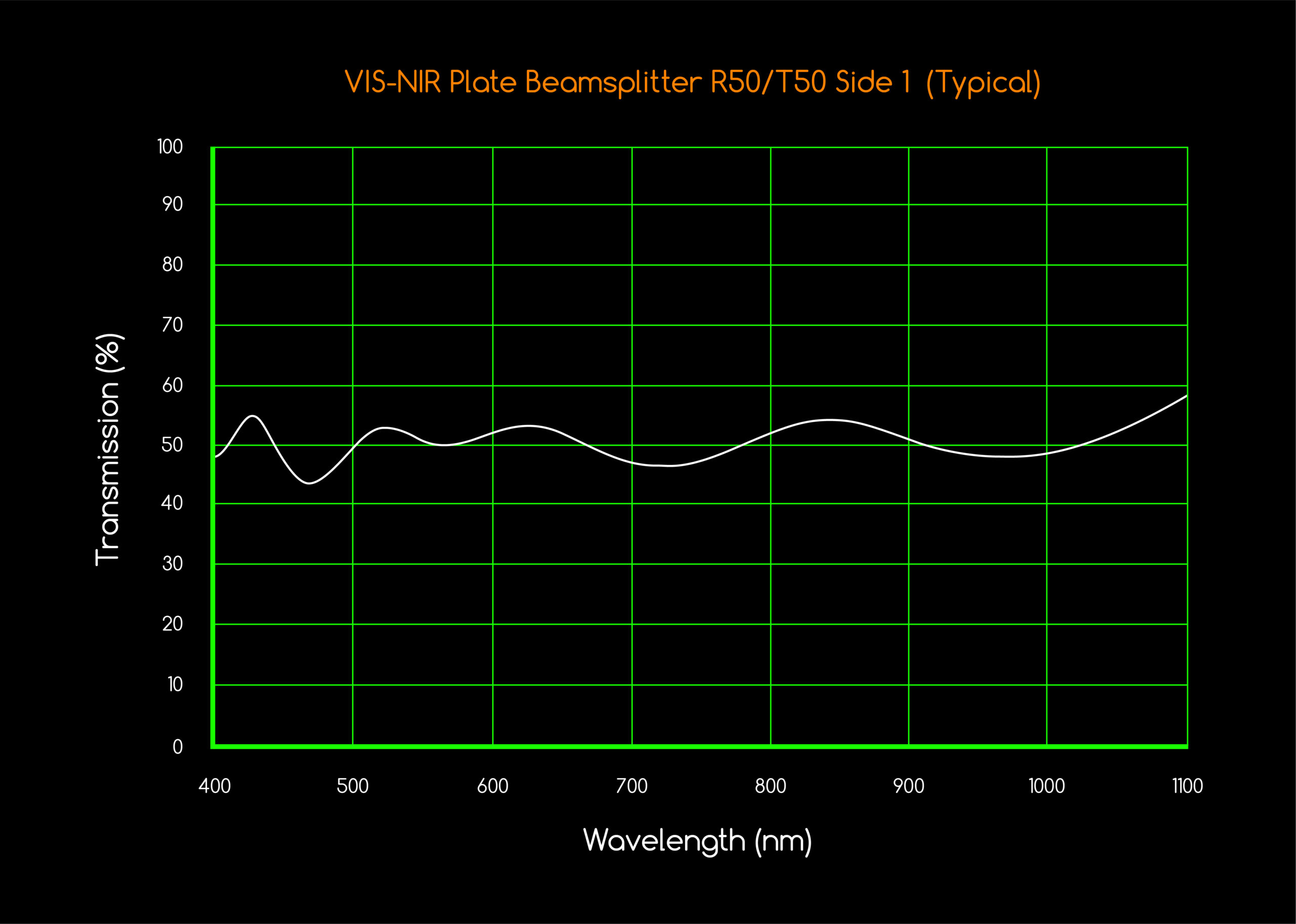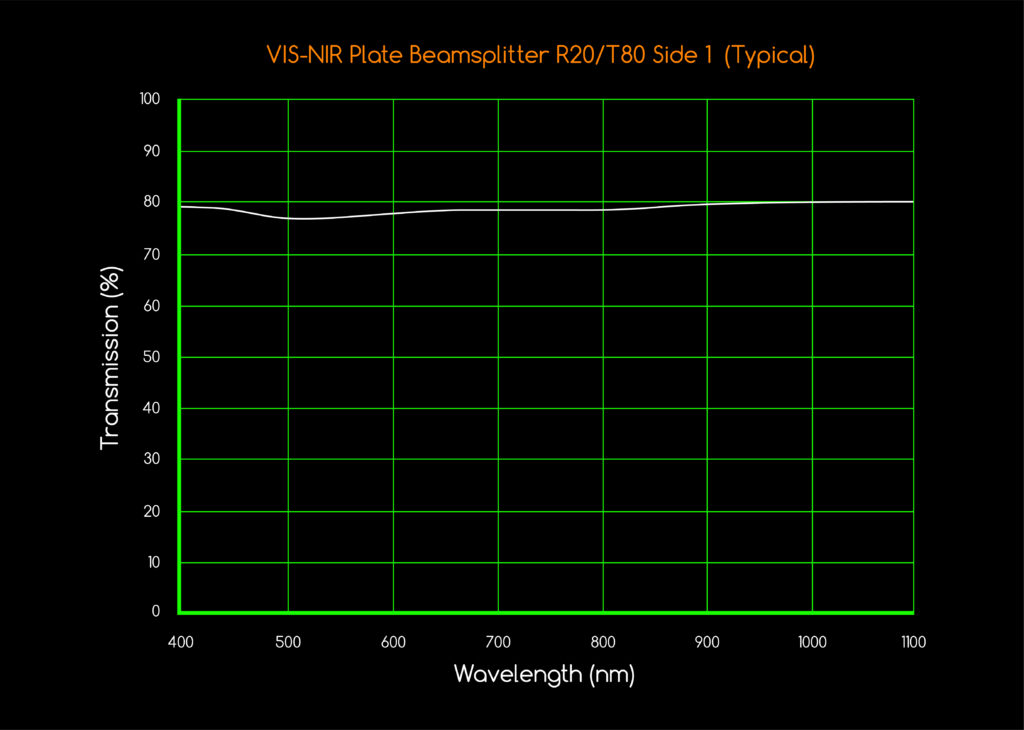 | Coating | 1 side R50/T50 Beamsplitter coating for VIS-NIR --or-- 1 side R20/T80 Beamsplitter coating for VIS-NIR --or-- 2nd side AR coating for VIS-NIR =/< 1.0% Angle of Incidence: 45 degrees @ 400nm to 1100nm for all types |