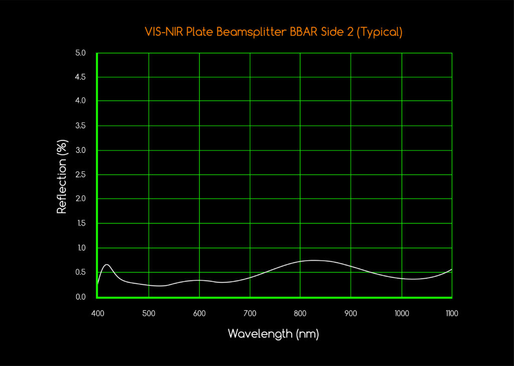 Our standard VIS-NIR Plate Beamsplitters are an optimized, lightweight and affordable option for image/light splitting within a 400-1100nm wavelength range. Coatings are applied on polished optical substrates using ion assisted deposition to produce tough, durable surfaces. The first surface coating defines the beam splitting transmission and reflection ratios which are available in R50/T50 & R20/T80. All our Plate Beamsplitters are BBAR coated on the second surface to minimize ghosting and to improve overall performance.