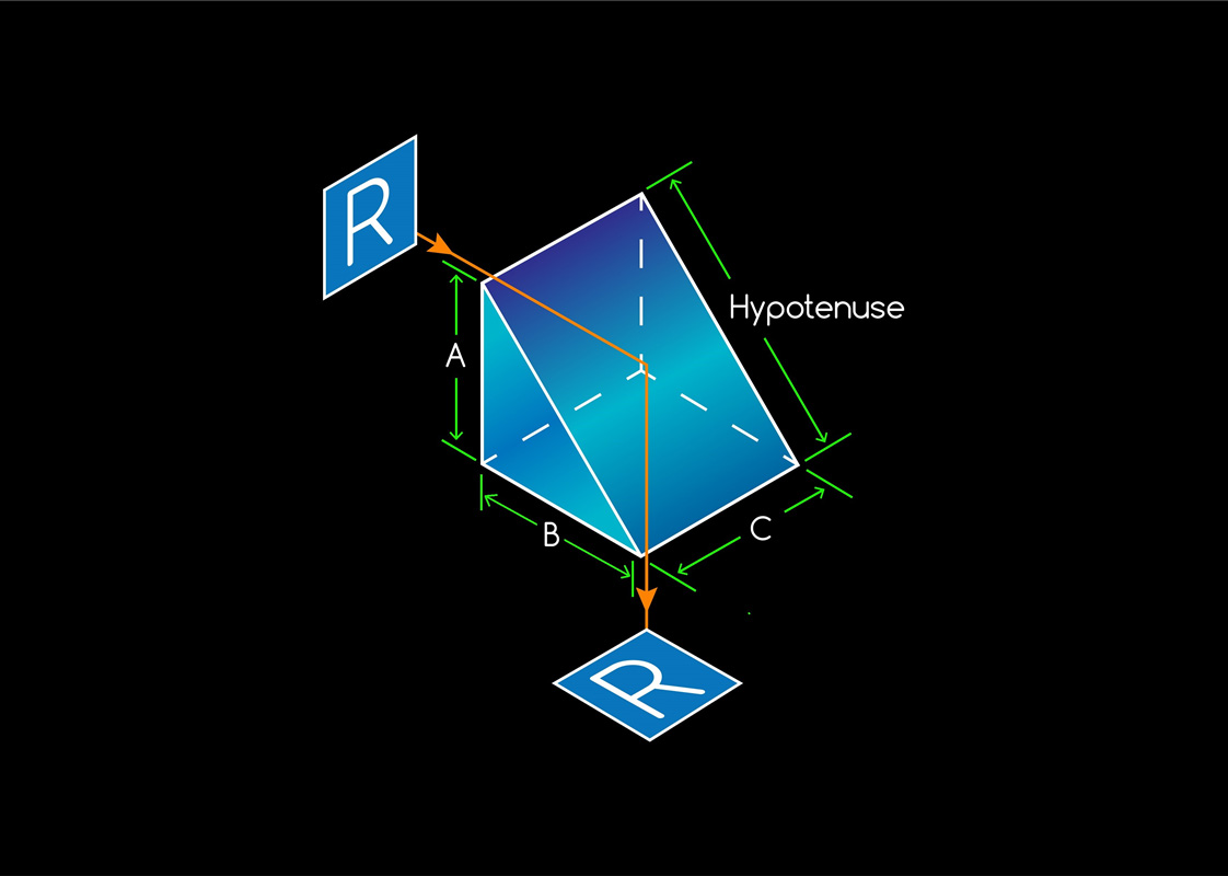 Right Angle Prisms are commonly used to bend light at a 90° angle. When a light ray entering through one of the prism’s legs hits the glass/air boundary of the hypotenuse, total internal reflection occurs and the reflected light exits through the other prism leg. Images are inverted, but correct left-to-right. Heli Optical Systems offers N-BK7 Right Angle Prisms with a mirror coated hypotenuse surface, and AR coating on the legs to reduce surface loss and optimize the reflection.