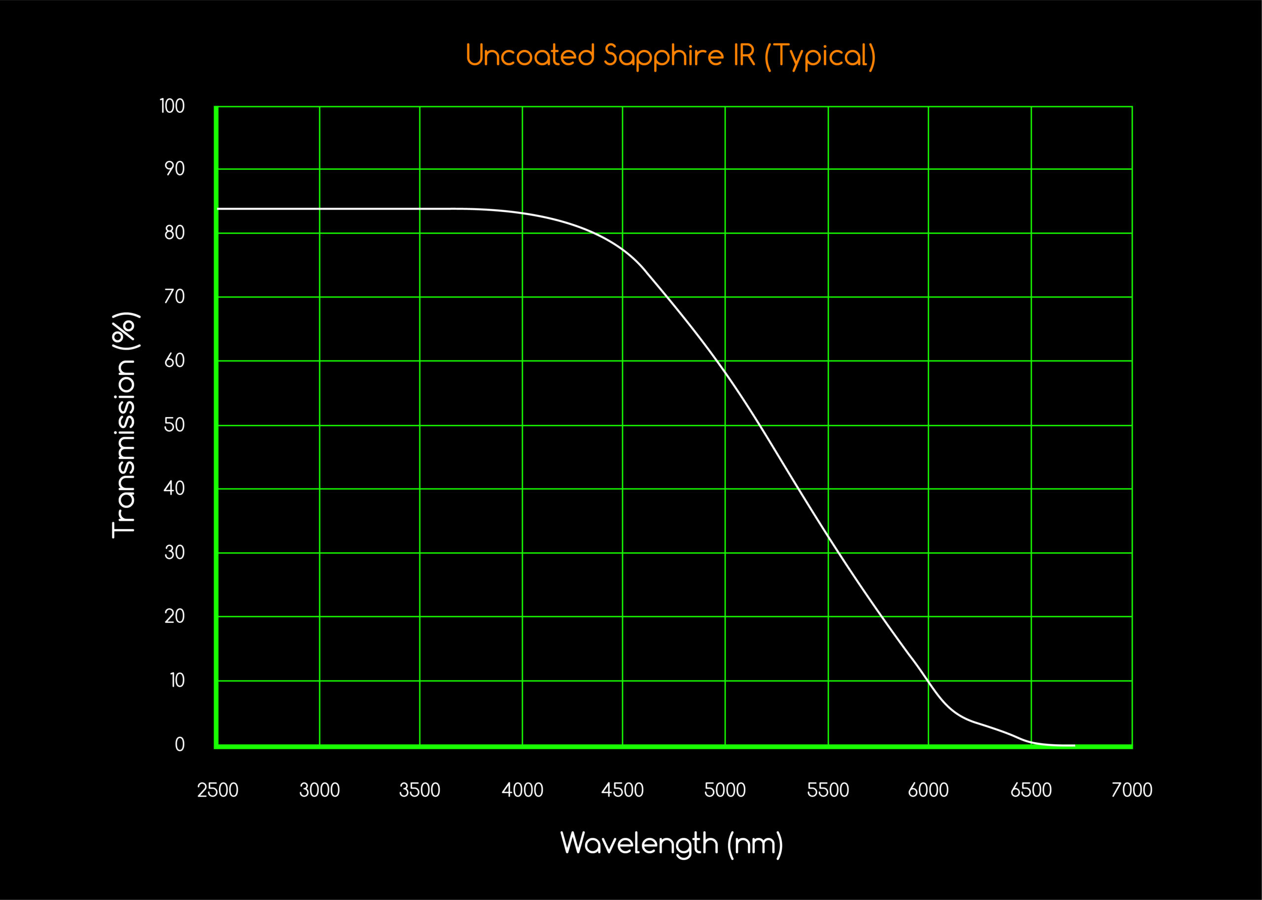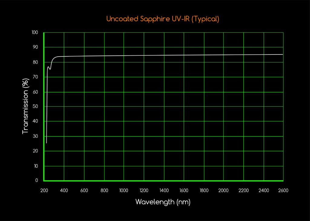 Sapphire has excellent mechanical and optical properties. It is extremely hard (9 on the mohs scale) and has a strength which is retained even at elevated temperature. In addition, it is resistant to virtually all forms of chemical attack. It has a transmission band which extends from the UV at around 180 nm, throughout the visible and near to mid infrared regions to 6500 nm.
